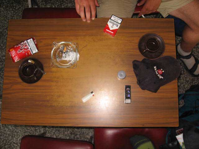 Lo stesso tavolino nello stesso bar, in un paesino della Spagna, solo che ora Brian non c’è. Era andato in bagno a fare la cacca, non si sentiva bene già da qualche giorno, forse per via di qualcosa che aveva mangiato, e poi tutti sanno che caffé e sigarette hanno un effetto lassativo, 2007, stampa a getto d’inchiostro su carta fotografica, 9x 6,5 cm