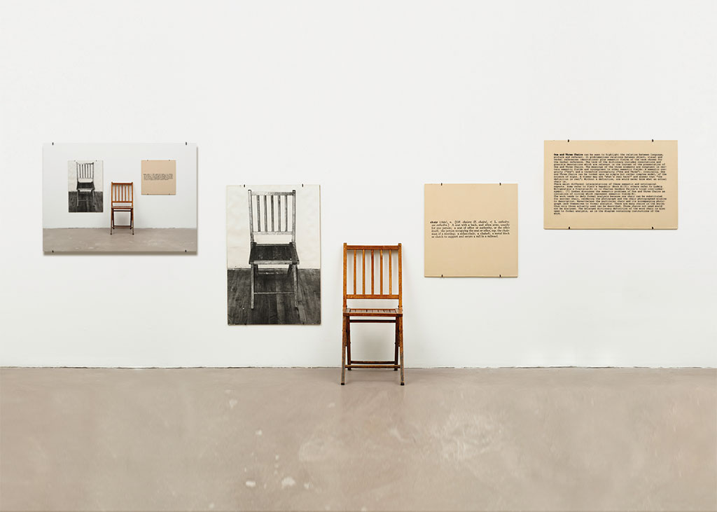one and three, one and three chairs with expansion possibility, 2012, installation project, riproduction of Joseph Kosuth’s “one and three chairs”, photograph and enlarged art work statement, variable dimensions