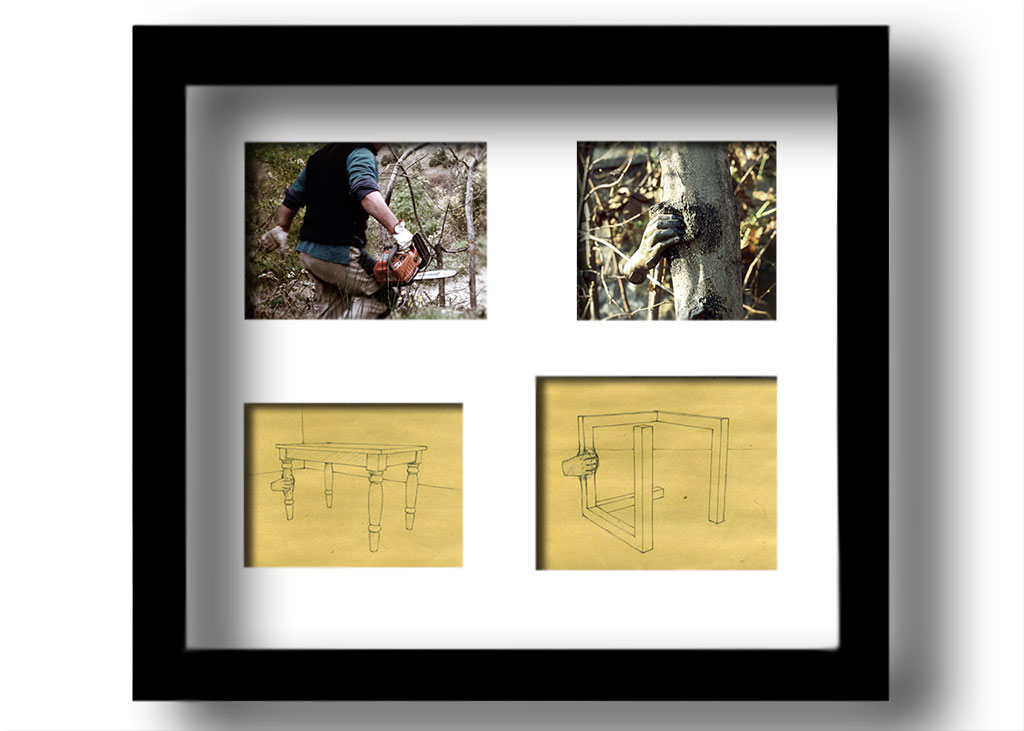 project to keep back a table in “Poor Art”, and/or to keep back opening a Sol LeWitt’s incomplete open cube, 2010, pencil drawing on paper and photographies framed, 23x30cm